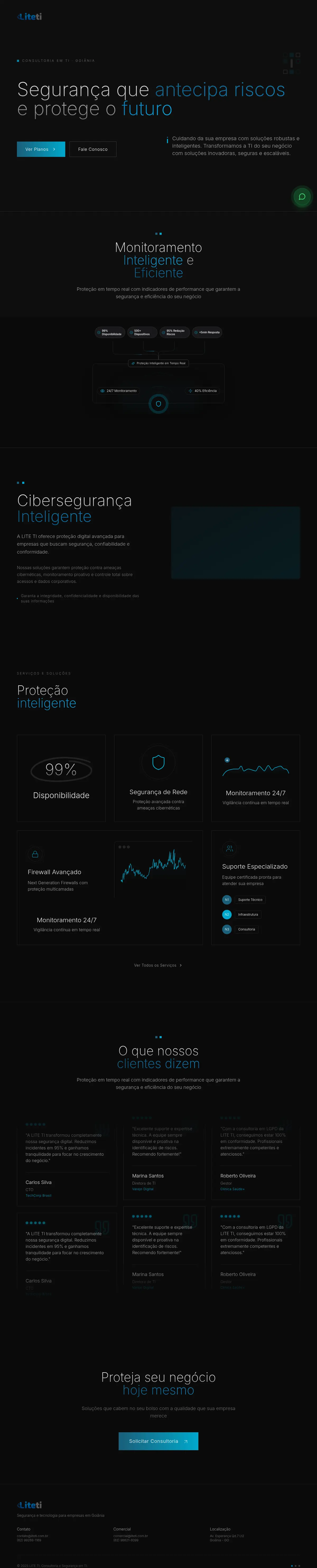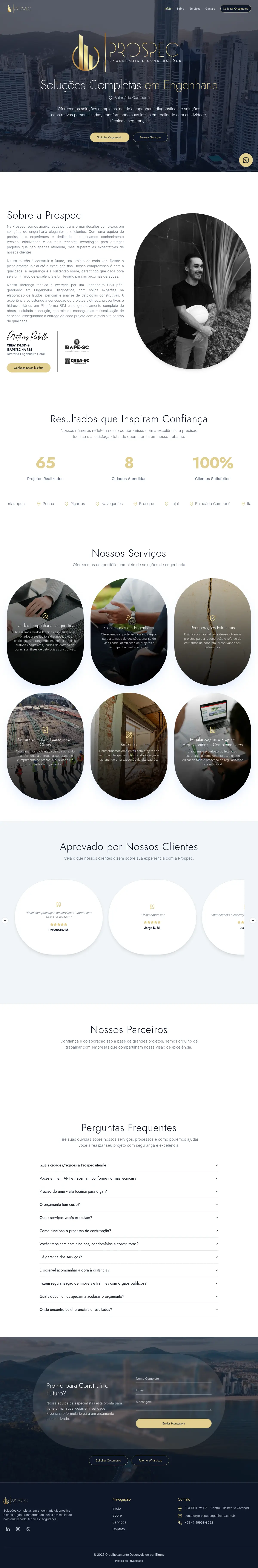 Site institucional elegante para consultoria de engenharia com portfólio de projetos e depoimentos.